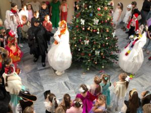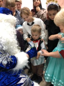 • Финальным аккордом стало праздничное мероприятие в актовом зале. Дед Мороз вручал подарки, внимательно слушал стихи ребят, а дети в ответ дарили всем своё творчество — пели песни и танцевали.